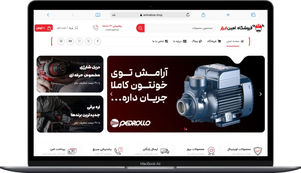 سایت حوزه فروش آنلاین و حضوری محصولات ابزار یراق و پمپ آب که طبق سلیقه کارفرما به صورت کاملا رسپانسیو اجرا شده است.